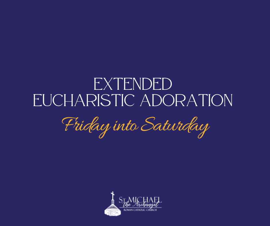 Extended Eucharistic Adoration – Friday into Saturday Regular Friday Adoration will begin immediately following the 8:30 AM Mass and will continue uninterrupted through the night for a special Overnight Adoration