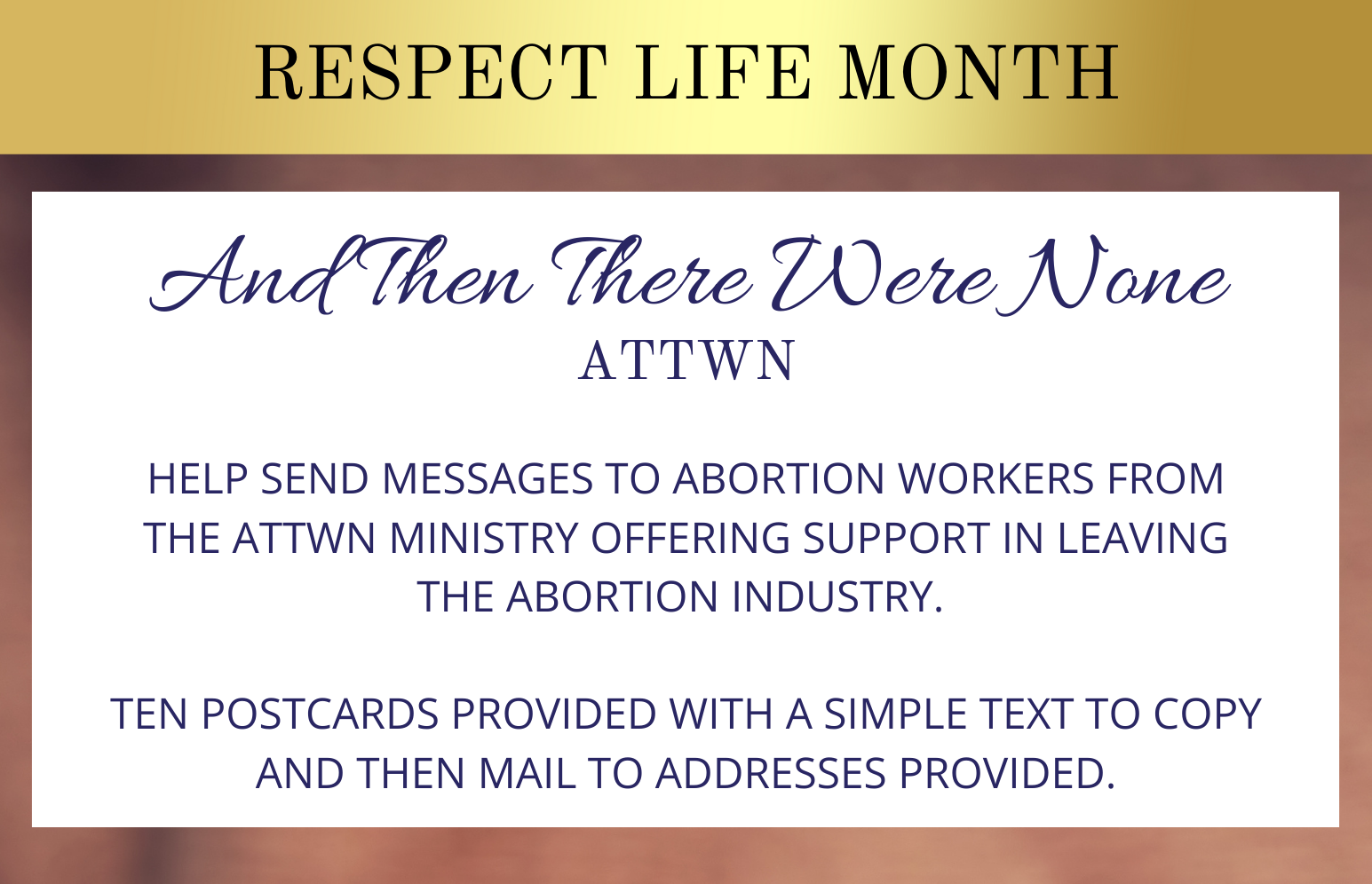 - ATTWN (And Then There Were None) – Pick up postcards, helping abortion industry workers leave the industry.