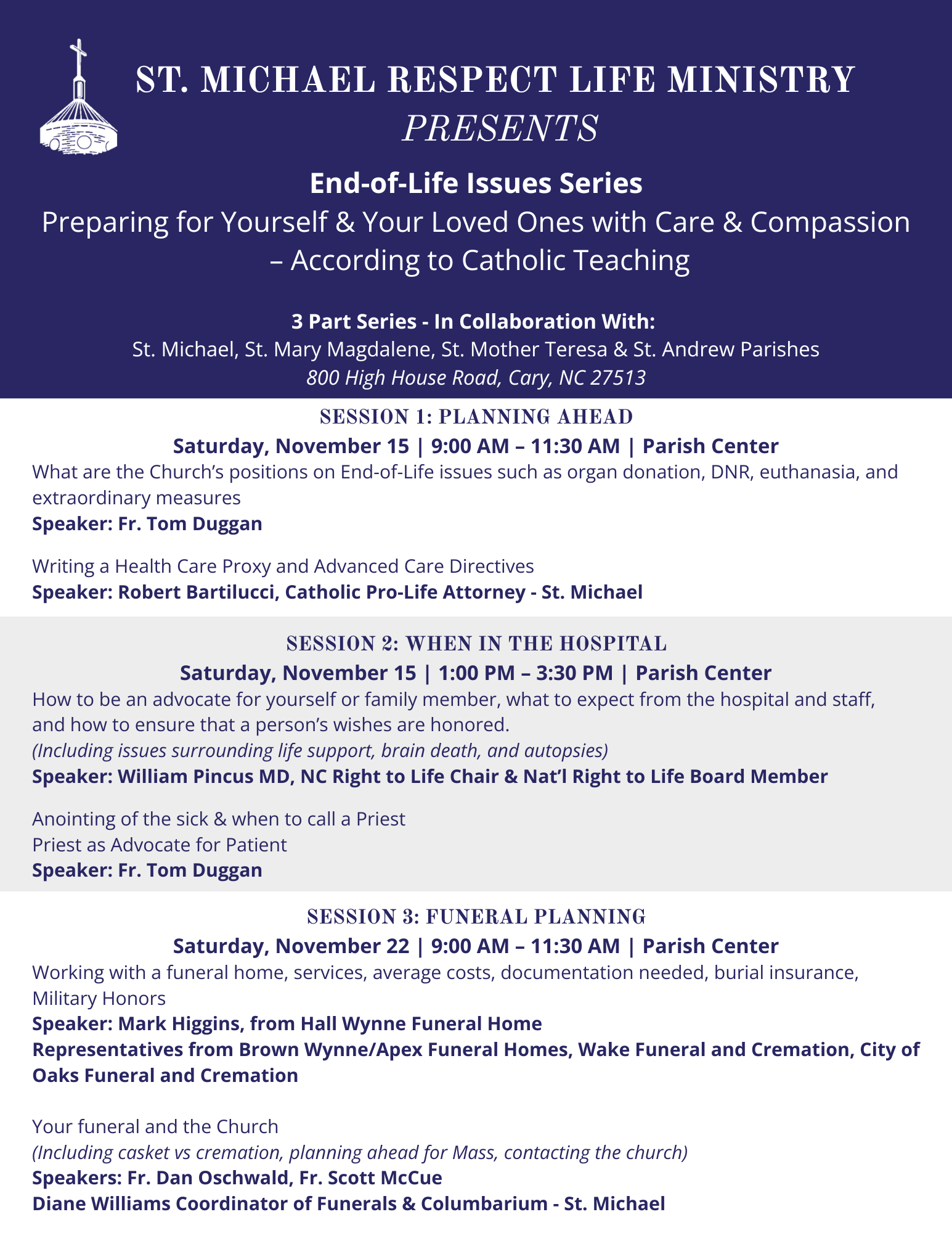 Educational sessions on Catholic teaching, legal, and medical guidance for end-of-life decisions.