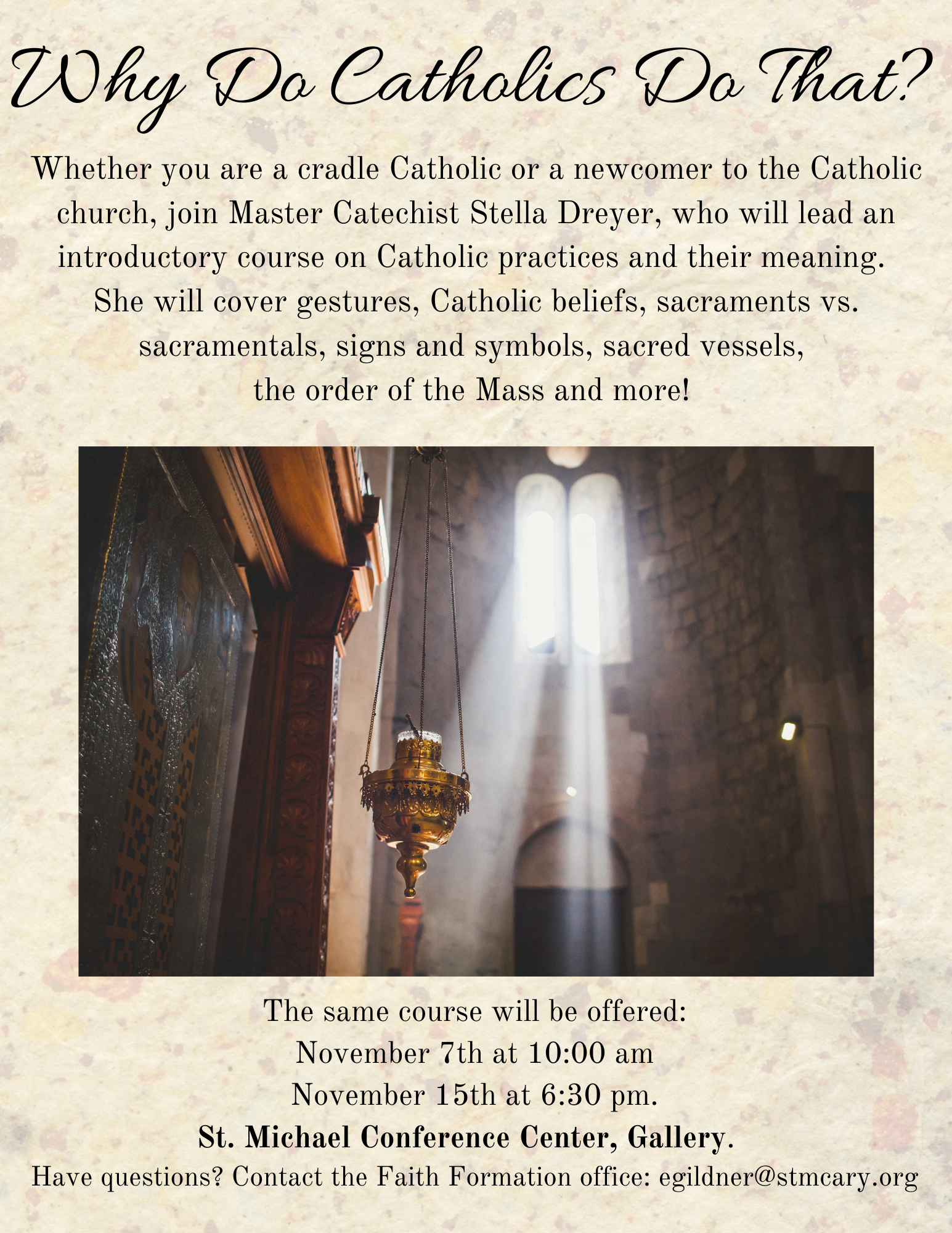 Whether you are a cradle Catholic or a newcomer to the Catholic church, join Master Catechist Stella Dreyer, who will lead an introductory course on Catholic practices and their meaning.