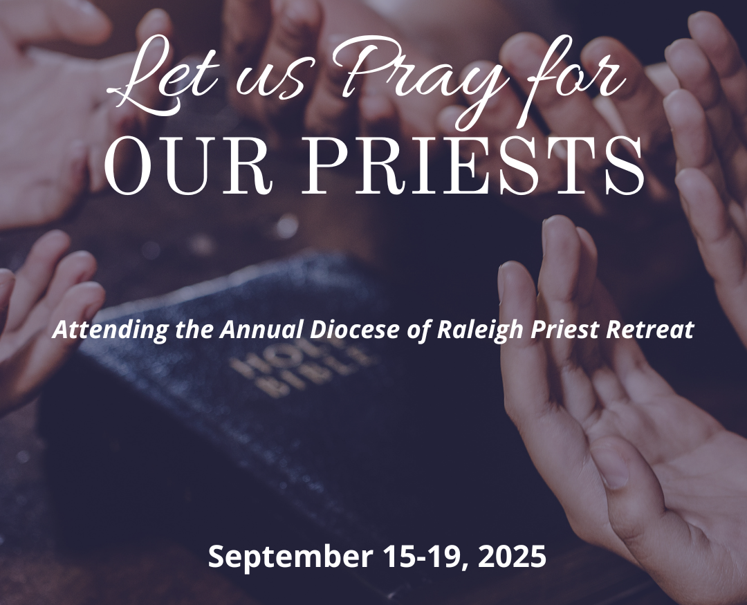 The priests of the Diocese of Raleigh will be away September 15–19 for the annual Priest Retreat. No Mass Monday–Friday Communion Service each morning at 8:30 AM (English) and Tuesday