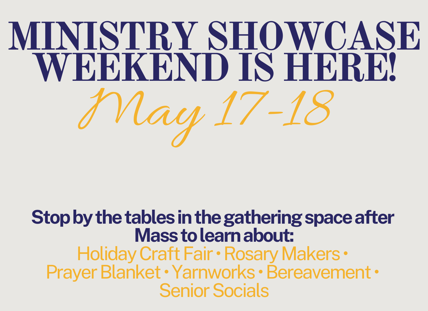 Welcome to our Ministry Showcase Weekend! We’re so glad you’re here. Before or after Mass this weekend, stop by the ministry tables in the gathering space to meet some of