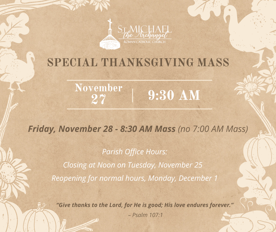 Mass Update and Thanksgiving Schedule Thanksgiving Mass Join us in giving thanks to the Lord! Thursday, November 27 at 9:30 AM Please Note: Friday, November 28, only the 8:30 AM