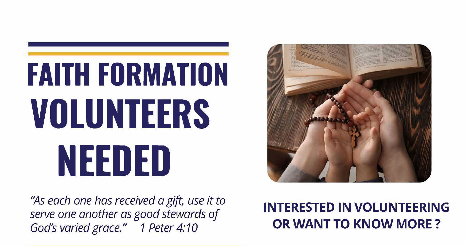 Monday, July 22 | 7:00 PM | Online Have you ever felt called to serve in Faith Formation? Whether you enjoy working with children, teens, or adults or supporting behind